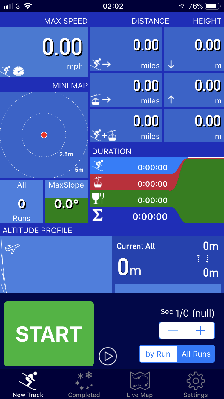 New Track is the the place that lets you start recording for a day out on the slopes. To start recording, press ‘START’. You can’t miss it, it’s the great big green button. You know when you have hit it, as the big button will disappear and be replaced with some smaller buttons. These are: