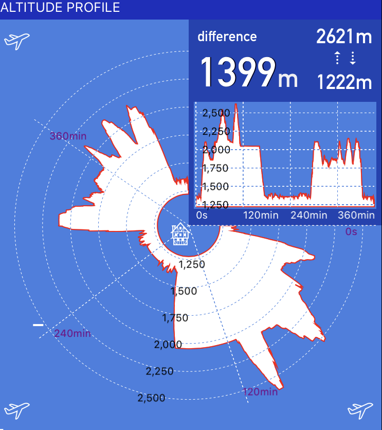 The larger, and perhaps the graph that looks more interesting, shows the same changes in height, but, on this graph, the time moves around a circular path. 0 seconds, is shown at the 3 o’clock position, and this represents the start of your ski-day. Time then sweeps around in a clock-wise fashion. If your altitude doesn’t change, maybe because you are in a restaurant, then a segment of a circle is traced out showing that you were at the same altitude for a period of time. (This happens just before 120 mins on the image above, and lasts for around 60 minutes.)